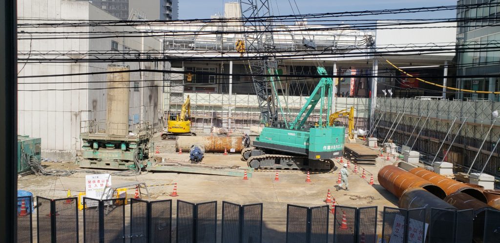 全周回転するケーシングの先端に取り付けたケーシングビットで削孔を行う「オールケーシング工法」です。N値の高い硬質地盤・転石層・玉石層・岩盤・鉄筋コンクリート構造物などの掘削施工を高能率で行います。バランスの良い押し込み力と高精度の鉛直性で、大口径・大深度施工も容易にこなします。連続壁基礎や地盤改良など多様な基礎工事にも活用されています。