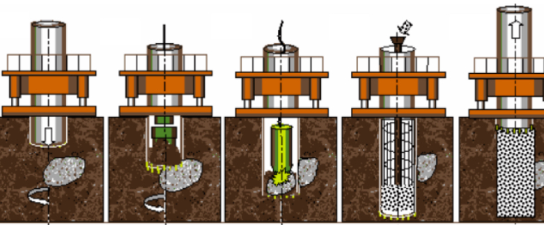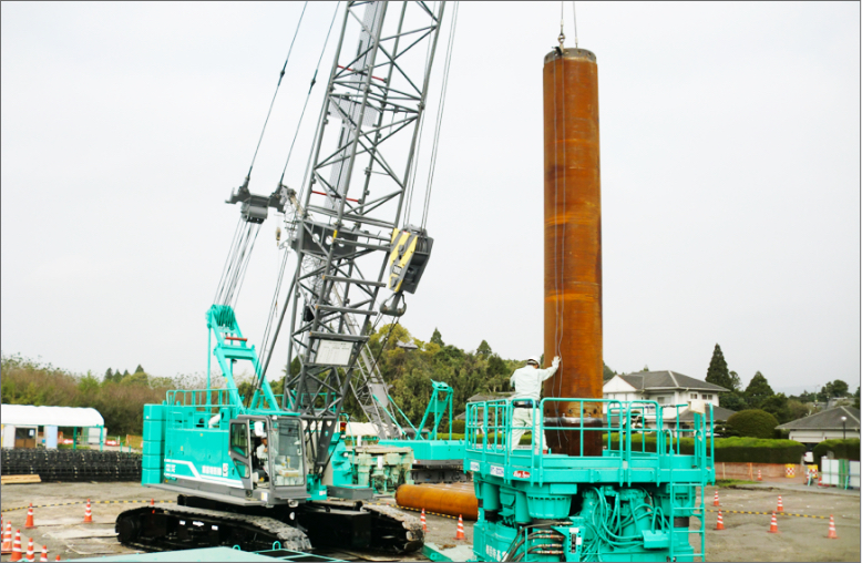 全周回転掘削機にてケーシングを地中に圧入し、孔壁を保護しながらハンマーグラブで掘削・土砂の排出を行い、できた孔に鉄筋かごを建て込んだ後、トレミー管でコンクリートを打設して杭を築造する工法です。軟弱地盤から硬質地盤までどのような悪条件下にあっても無振動・無騒音で作業を行う画期的な工法。施工は全周回転式オールケーシング工法で行われるため、垂直精度も高く杭の信頼性が大きい点も特徴の一つです。