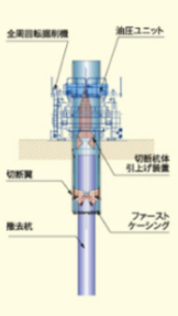 全周回転式オールケーシング機を使用し、油圧駆動による2枚の切断翼で既存杭や地中構造物を地中で 切断・撤去する工法です。切断作業には油圧駆動による切断機を使用するので、切断時の騒音・振動はほとんど発生しません。また、切断する杭の位置を任意に設定できるため、クレーンの能力に見合った長さ(重量)で切断することができます。